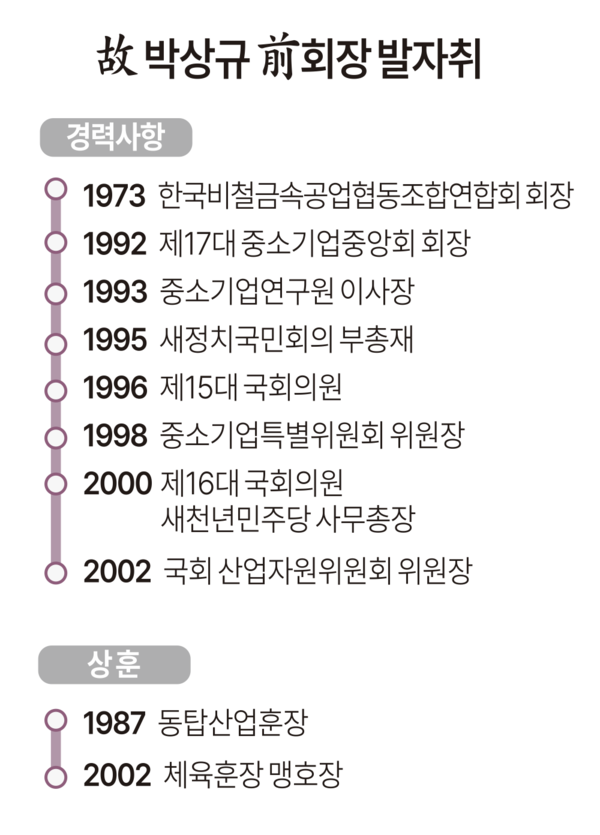 향년 89세로 지난달 24일 숙환으로 별세한 고(故) 박상규 전 회장은 1972년 한일비철금속 사장을 시작으로 한보금속공업 대표이사, 한국비철금속공업협동조합연합회 회장 등을 역임하며 대한민국 경제가 격변하던 시기에 비철금속 산업의 경쟁력 강화와 중소기업 발전에 중추적인 역할을 수행했다.