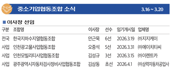 중소기업협동조합 소식 - 2026.03.23 등록일 2026.03.23 바로가기 http://www.kbiznews.co.kr/news/articleView.html?idxno=113719 이전글 ‘천연석 가공제품, 전문기관 검사대상서 제외’ 성과 합작 다음글 경기인천기계조합, 조합원사 베트남 진출 지원 협력체계 구축 목록