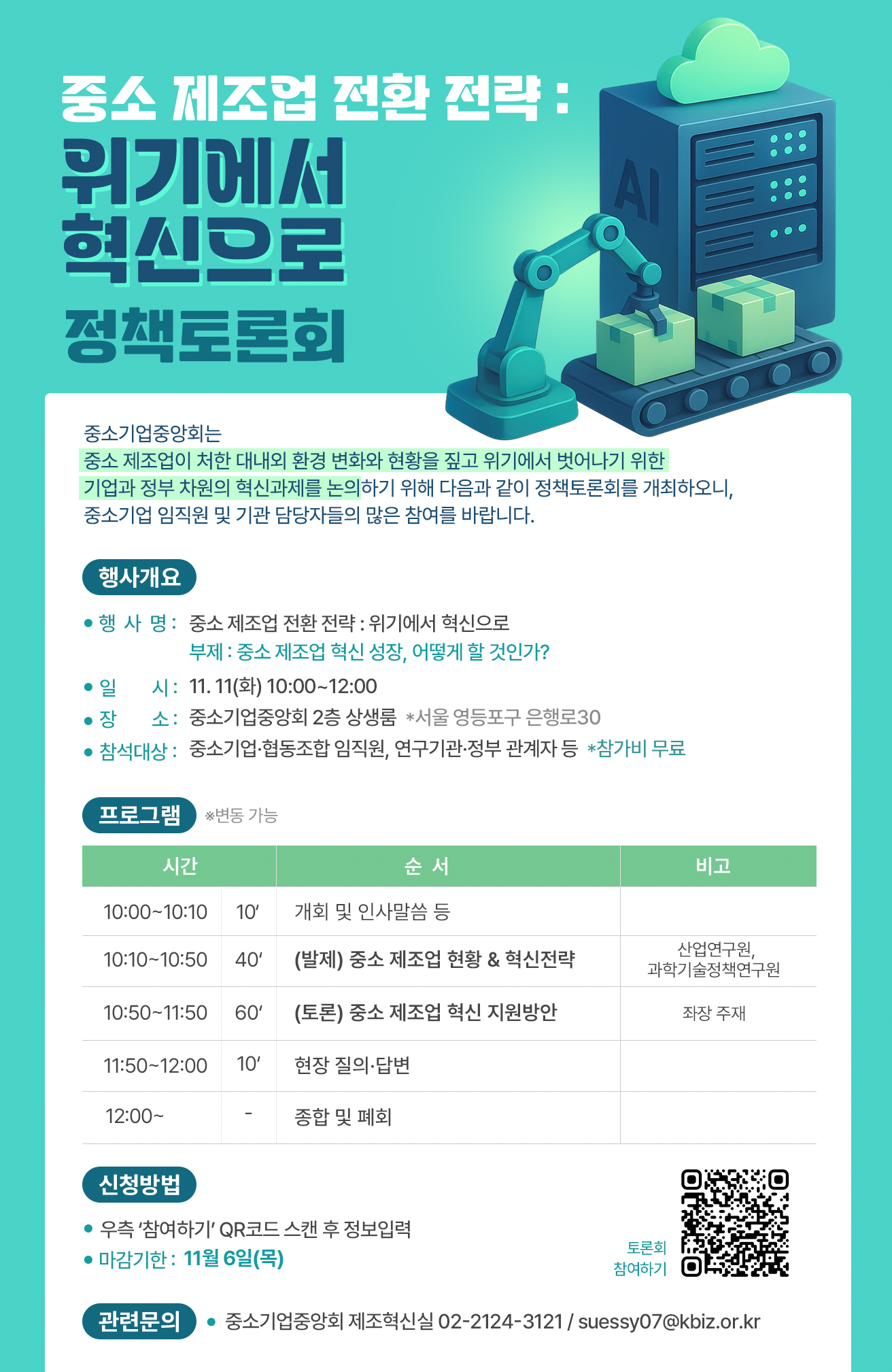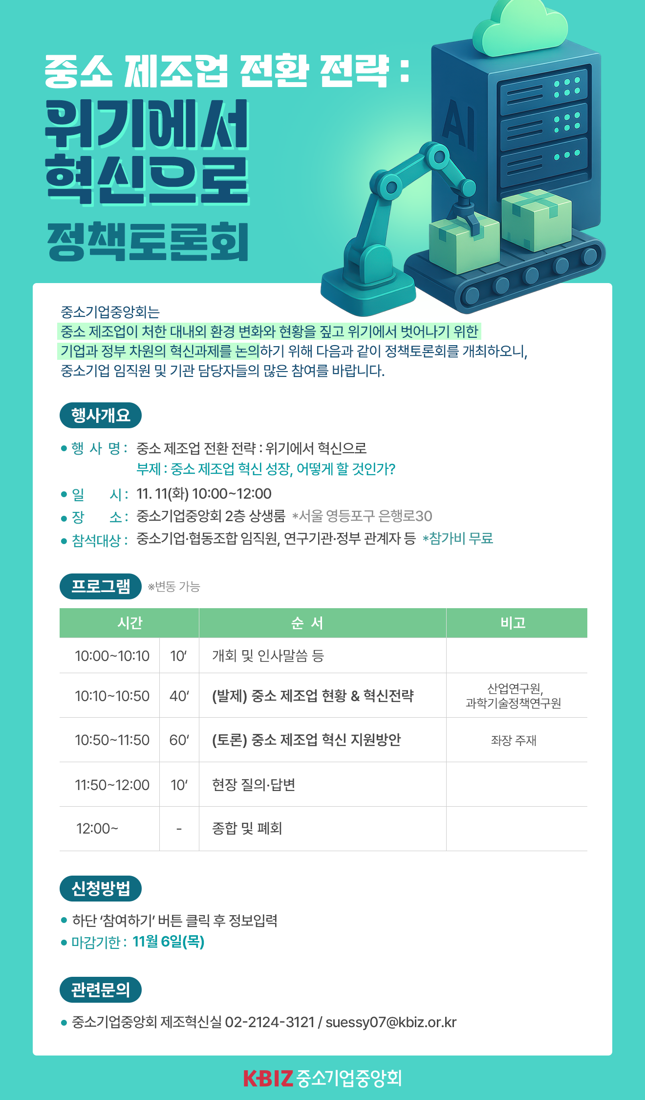 [제조혁신실] 「중소 제조업 전환 전략 : 위기에서 혁신으로」 정책토론회 개최 및 참석 안내