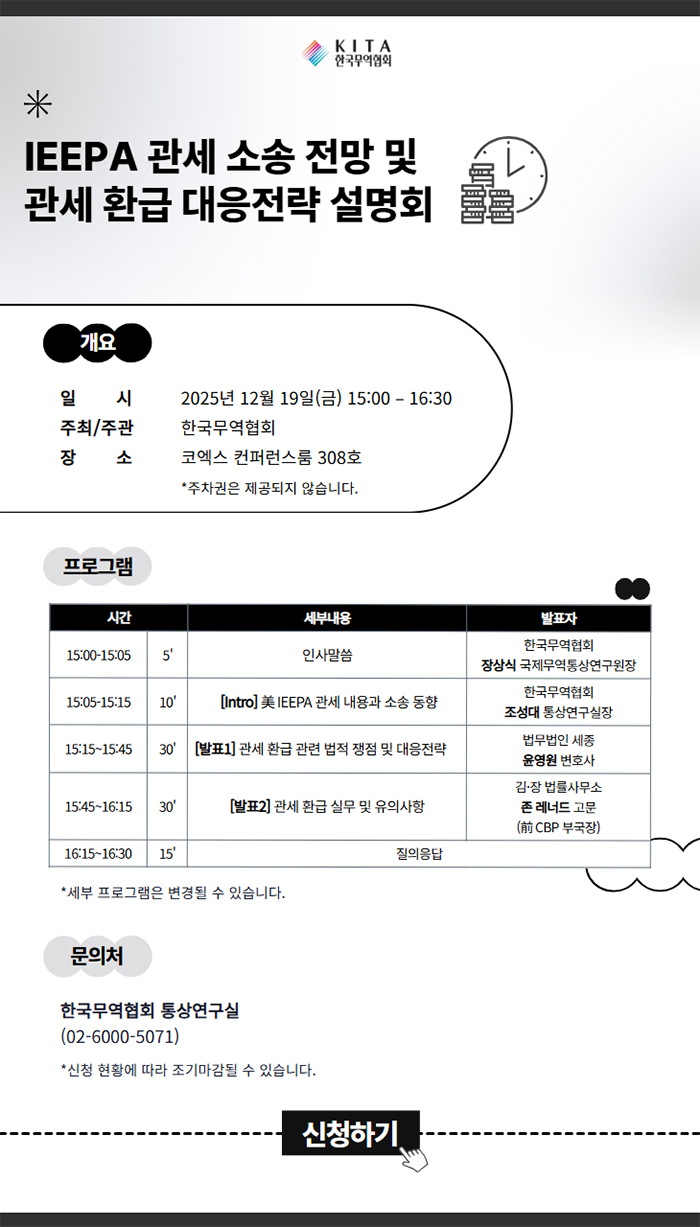 [한국무역협회] 美 IEEPA 관세 소송 전망 및 관세 환급 대응전략 설명회 개최 안내