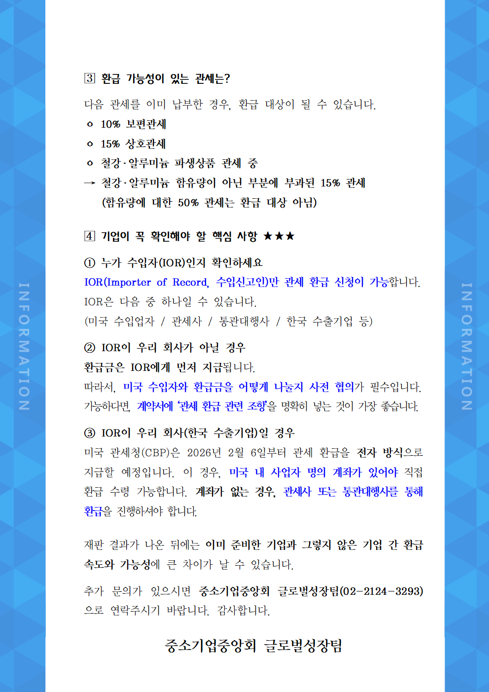 [글로벌성장팀] 미국 IEEPA 관세 재판 관련 관세 환급 대비 안내 등록일 2026.01.30 파일첨부 KOTRA 미국 관세청 수입신고정정 및 이의신청 가이드 2601.pdf(6.8 MB) 다운로드 바로보기 이전글 [사회공헌실] Lovely Concert 중소기업사랑나눔콘서트 <청주> 참가신청 안내 다음글 [한국무역협회] 미국 IEEPA 관세 환급 전국 설명회 개최 안내 목록