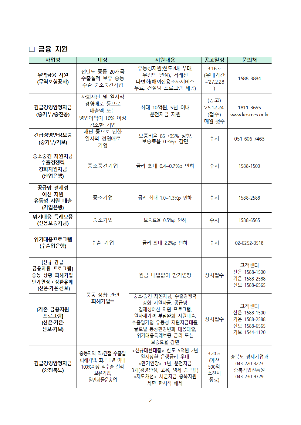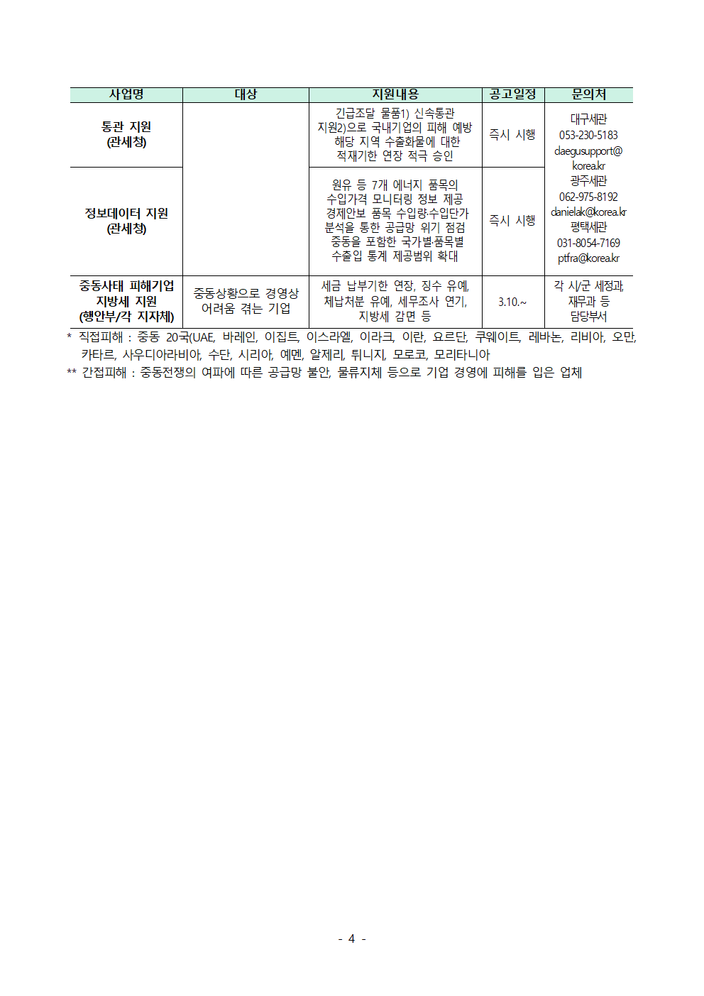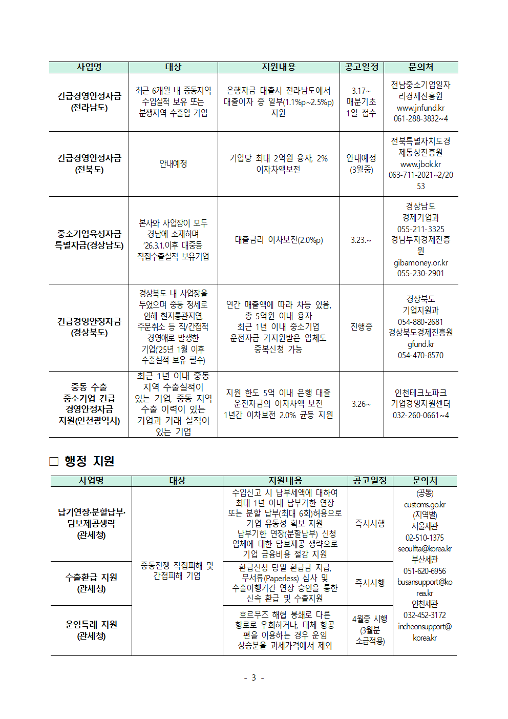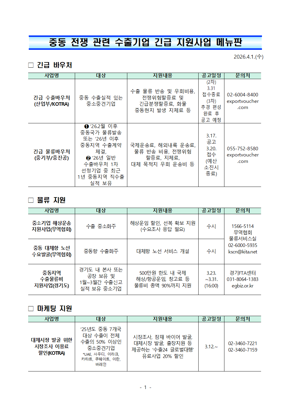[글로벌성장팀] 중동 전쟁 관련 중소기업 지원사업 안내 등록일 2026.04.03 파일첨부 중동전쟁 애로기업 지원사업 메뉴판(4.1).pdf(449.3 KB) 다운로드 바로보기 이전글 [코트라] 美 철강, 알루미늄, 구리 파생상품 관세 부과 개편 주요 내용 다음글 [글로벌성장팀] 중동 대체물류 수요 발굴을 위한 설문조사 참여 요청 목록